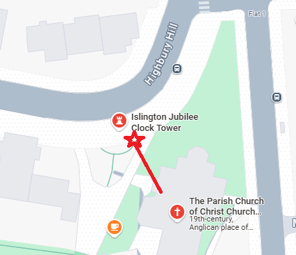 Christ Church Highbury (Tuesdays): Exit the building and head straight to the Clock Tower which is straight ahead.