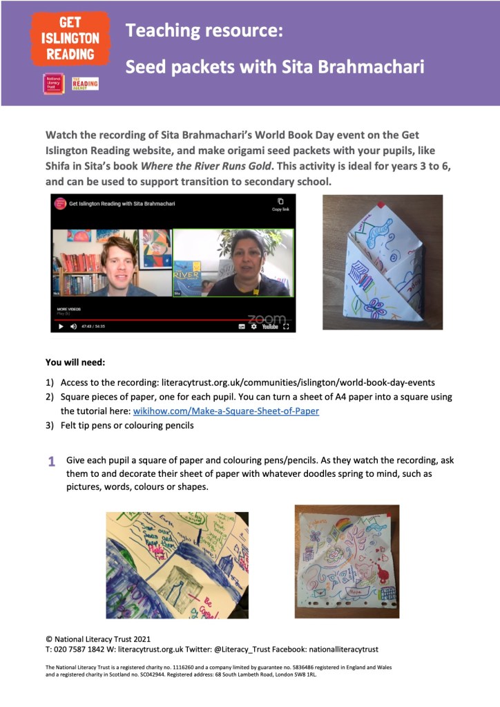 Watch the recording of Sita Brahmachari’s World Book Day event on the Get Islington Reading website, and make origami seed packets with your pupils, like Shifa in Sita’s book Where the River Runs Gold. This activity is ideal for years 3 to 6, and can be used to support transition to secondary school.