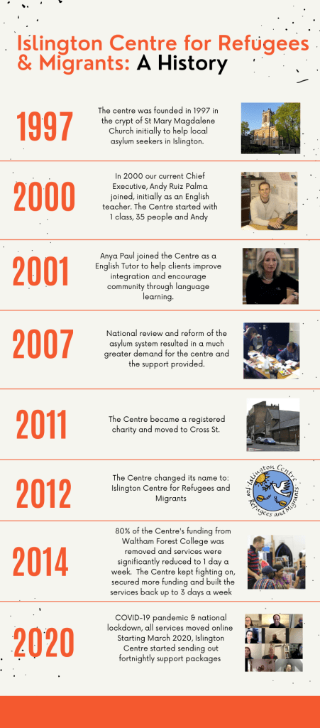 The centre was founded in 1997 in the crypt of a church in Islington to help local asylum seekers in Islington.