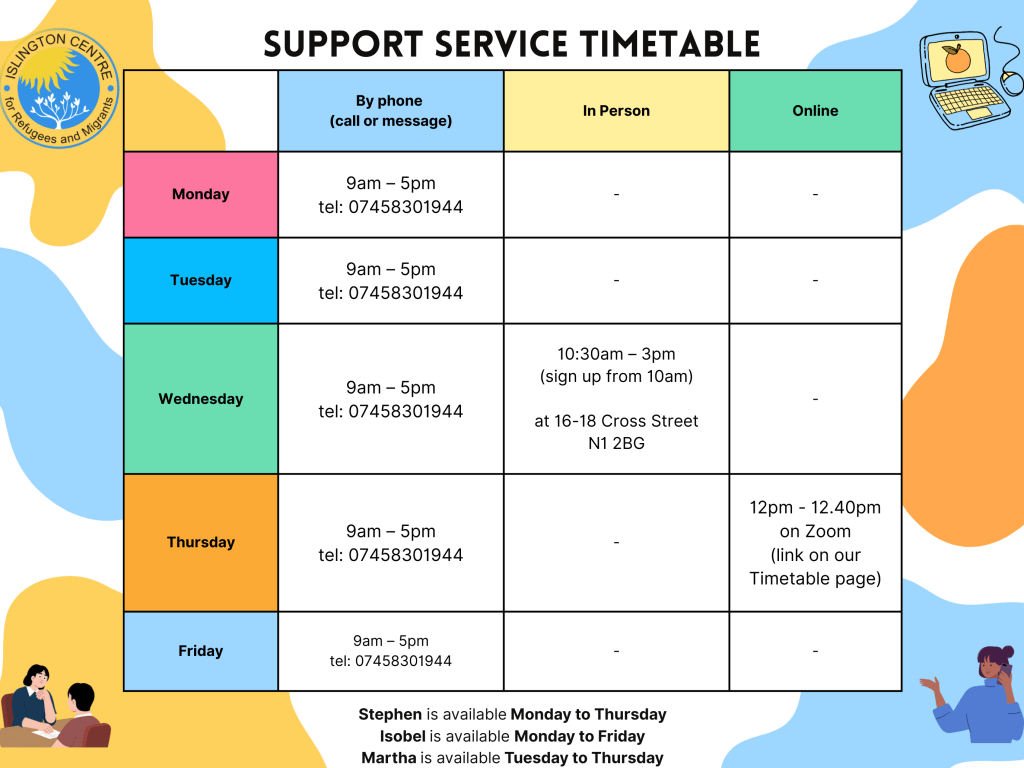 The Support Service Team (Stephen, Isobel and Martha) works 9:00am – 5:00pm Monday through Friday every week to provide one-to-one casework to help refugees and asylum seekers in London overcome practical challenges in order to build a stable and happy life in the UK. The Support Service plays a crucial role in providing emotional support, advice, and advocacy by facilitating access to: