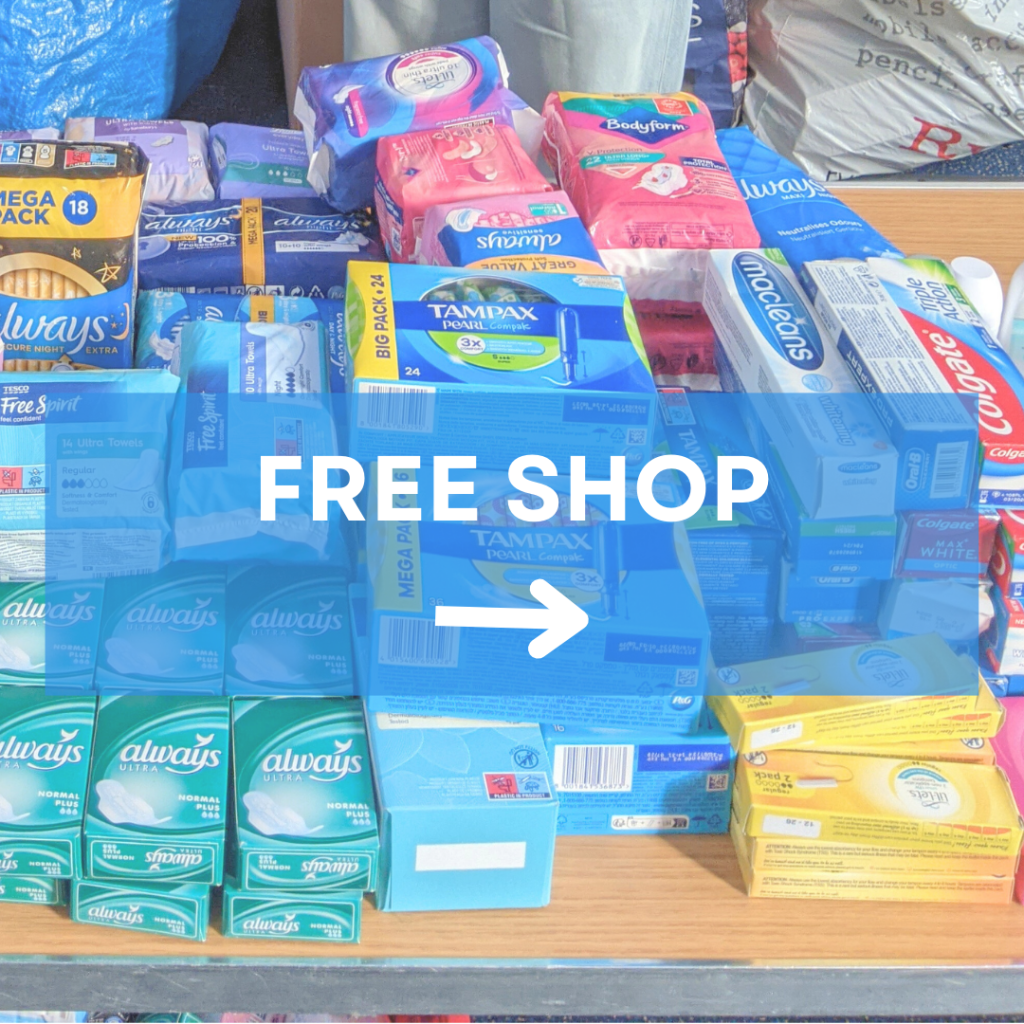 Our weekly Free Shop offers dignity and freedom of choice for our community to select and take home donated clothes, winter coats, toiletries, period products, and more.